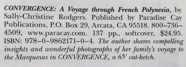 Convergence: A Voyage through French Polynesia is a very special book. While full of harrowing tales, it ends happily. It has huge crossover appeal resonating with sailors, adventure travelers, women, families, and those concerned about the environment.