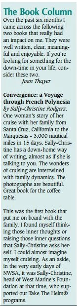 Finally, although Sally-Christine’s book is an ode to adventure and family, the narrative recognizes the critical issues facing the oceans. She writes passionately about preserving and protecting marine ecosystems, discussing her first-hand experience of the pollution and over fishing thousands of miles from shore and offers suggestions for what individuals can do to improve the situation. She founded the Grants and Sponsorship Department of West Marine forging partnerships with non-profits in recreational fishing and marine conservation projects. Putting her money where her mouth is, the proceeds from Convergence: A Voyage through French Polynesia go to benefit Marine Conservation.