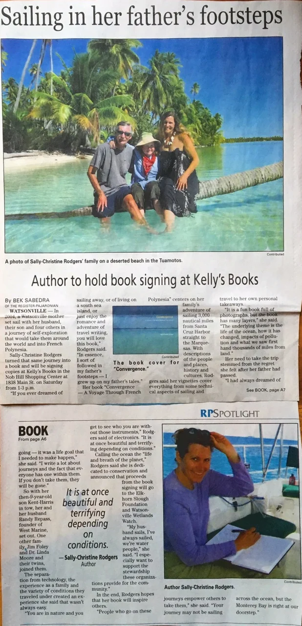 SAN FRANCISCO (March 25, 2015)All of us have dreams; places we’d like to go, adventures we’d like to take, plans we’d like to make reality. Sally-Christine Rodgers, whose childhood was filled with her father’s tales of South Sea islands, dreamed of sailing with her husband and son to the South Pacific. And she did. In her new book, Convergence: A Voyage through French Polynesia, Sally-Christine Rodgers tells an eloquent tale detailing her family’s adventurous journey from Santa Cruz, California across the Pacific Ocean and through French Polynesia. It is at times harrowing, often heart-warming, and in the end an engaging tale about a woman determined to follow her dream.